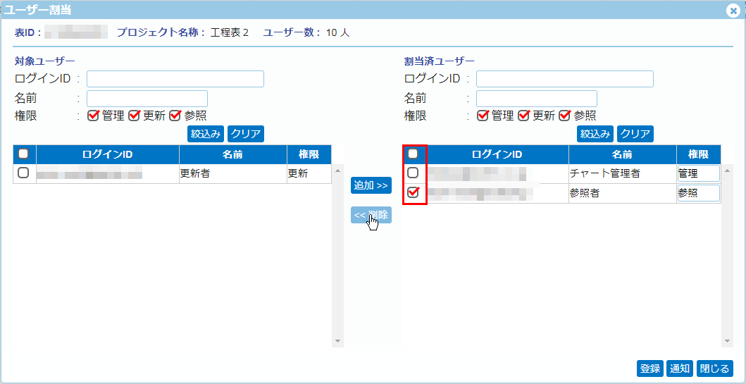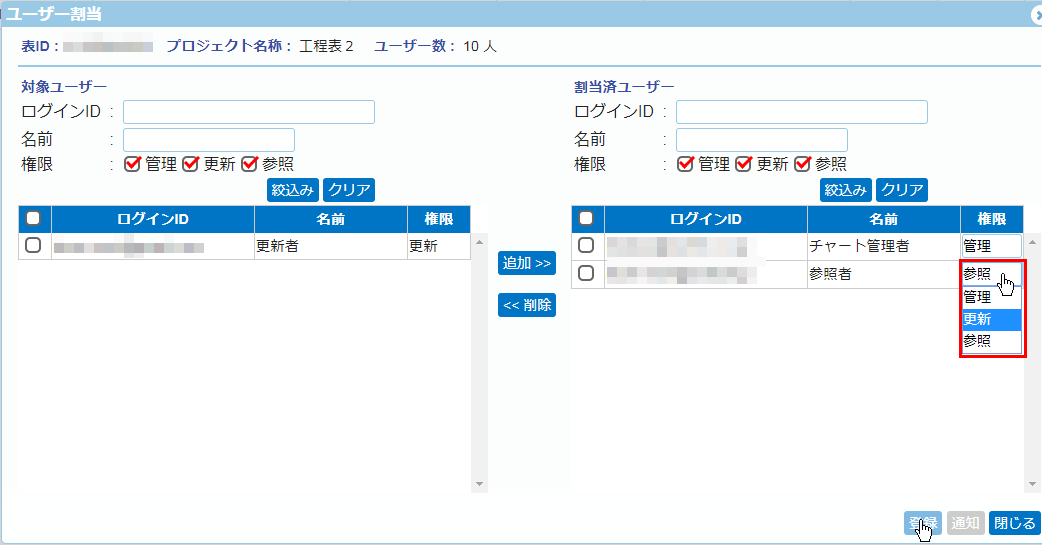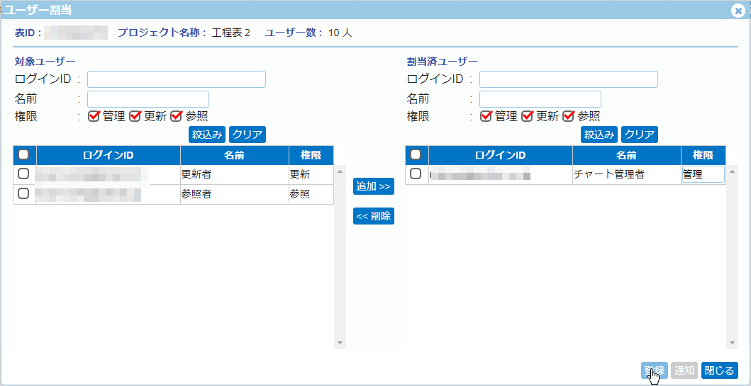 ※ここで設定する権限は、各ガントチャート毎の「ユーザー割当」の画面で、個別に変更できます。