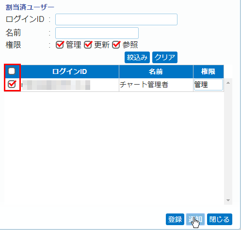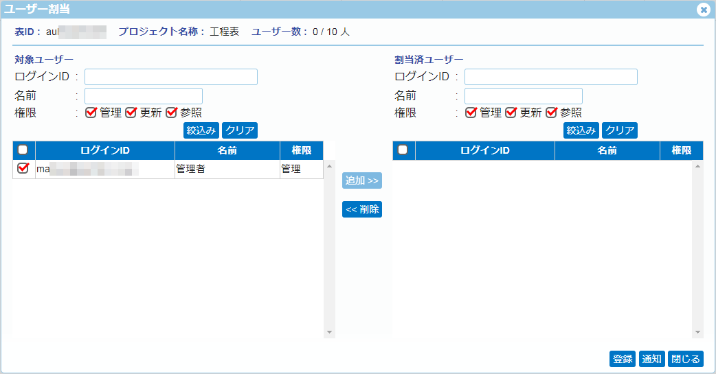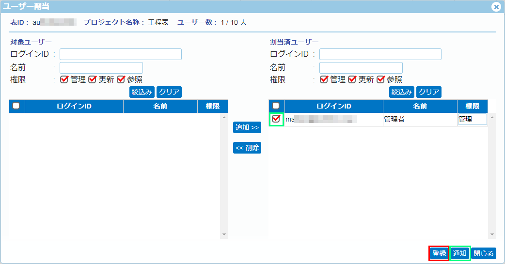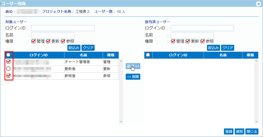 [追加>>]ボタンを押すと、チェックONされたユーザーは画面右の[割当済ユーザー]に移動します。