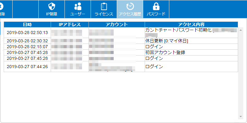 (1)登録済みガントチャートへの使用可、使用不可(ログインの許可)の管理ができます。