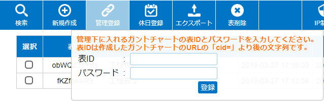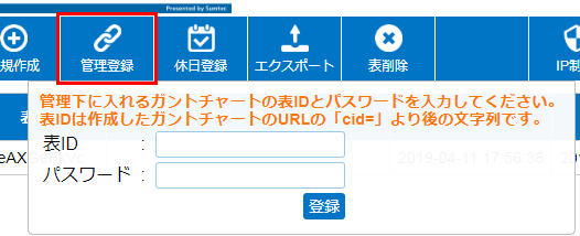 管理下に入れたいガントチャートの表IDとパスワードを入力し、「登録」ボタンを押してください。