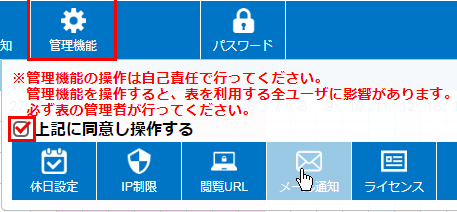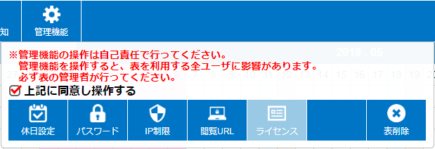 ログインができましたら、上部ボタン[表設定]→[上記に同意し操作する]→[ライセンス]