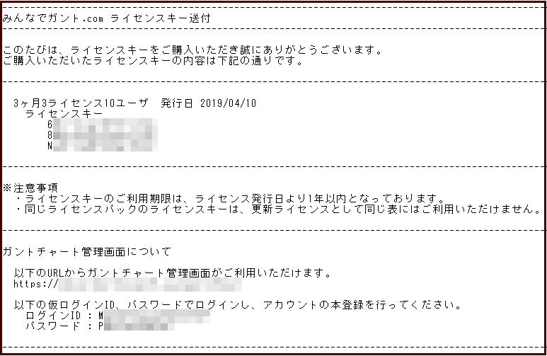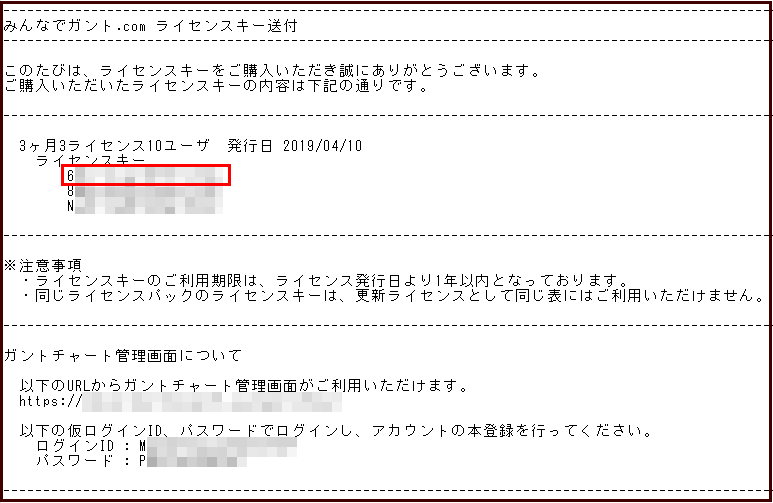 ④メールに記載してあるライセンスキーをガントチャートに登録します。