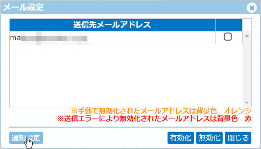なお、個別にメール通知の有効化、無効化を行いたい場合は「メール設定」画面の、対象ユーザーをチェックONし、[有効化][無効化]ボタンを押して下さい。