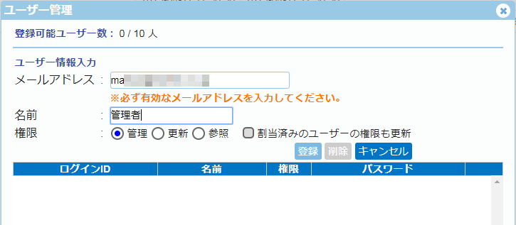 この画面では、「管理画面」で「ユーザー割当」が行われた、ユーザーのメールアドレスが表示されます。