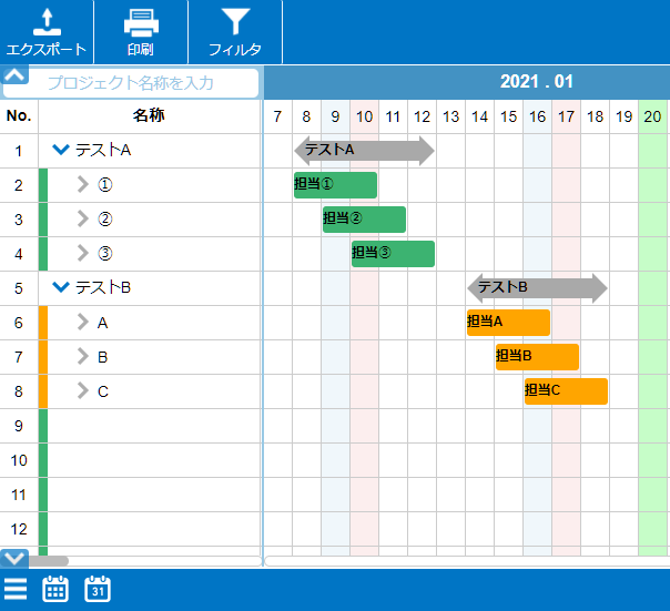 上図のように入力すると、それぞれのワードに合致したガントチャートが、一覧表に表示されます。