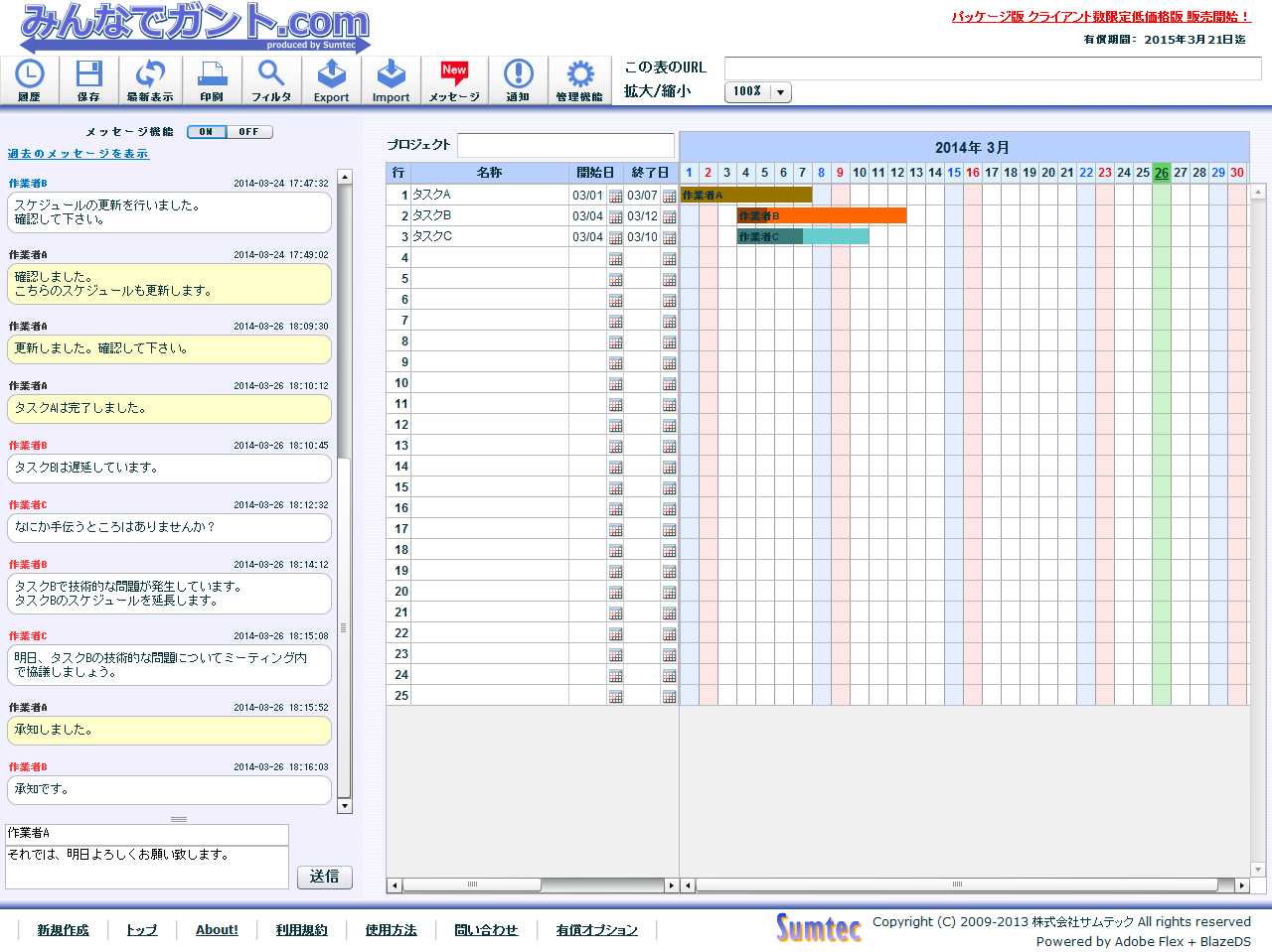 また、みんなでガントのガントチャートの更新と同じく、インターネットに繋げられるパソコンがあれば、どの場所にいてもメッセージのやり取りが可能ですので、 遠隔地同士でのコミニュケーションにもご使用ください。