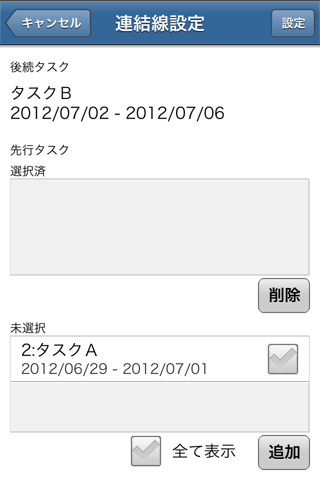 2.未選択のリストから、先行タスクを選択し「追加」ボタンをタップします。