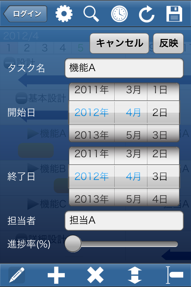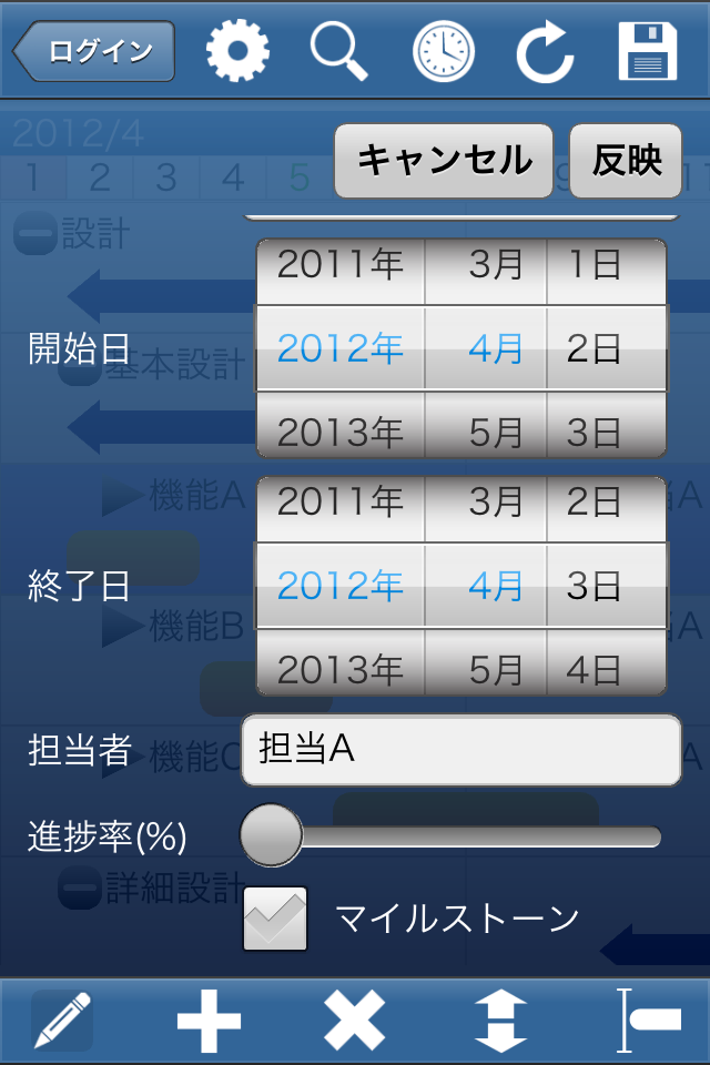 1.入力画面が表示されますので、タスク名、開始日、終了日、担当者を入力または選択します。また、進捗率とマイルストーンも設定します。