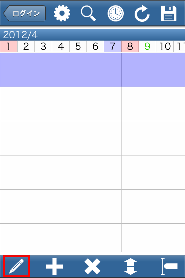 1.行を選択してから枠で囲っているボタンをタップし、祝日設定画面を開きます。